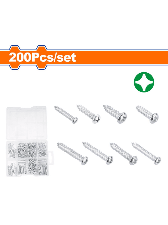 200 шт./компл. Самонарезающие винты с круглой головкой. Материал: углеродистая сталь. Обработка поверхности: оцинкованная. Отвертка: крестообразная. Размер и количество: 51 шт. - 3x12 мм 30 шт. - 3,5x25 мм 40 шт. - 3,5x12 мм 30 шт. - 3,5x19 мм 20 шт. - 4x19 мм 15 шт. - 4х25мм 14 шт. - 5х30мм Упакованы в пластиковую коробку.
