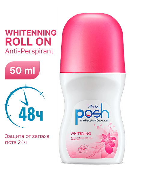 Posh Whitening — антиперспирант с отбеливающим эффектом, разработанный для эффективной защиты от пота и неприятного запаха. Формула с ухаживающими компонентами помогает осветлить кожу подмышек при регулярном использовании, делая её более ровной и гладкой.