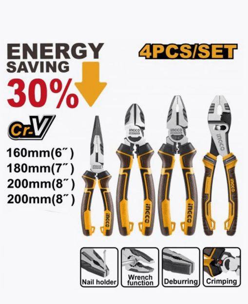 Набор из 4 плоскогубцев включает: 1 шт. 8-дюймовые комбинированные плоскогубцы с высоким рычагом 1 шт. 7-дюймовые диагональные кусачки с высоким рычагом 1 шт. 6-дюймовые длинногубцы с высоким рычагом Прочность на 30% меньше, чем у обычных плоскогубцев 1 шт. 8-дюймовые плоскогубцы с скользящим соединением Материал: Cr-V Обработка поверхности: черная отделка и полировка Трехцветная ручка TPR для надежного захвата и удобства С функцией обжима С функцией держателя гвоздя С функцией гаечного ключа С функцией снятия заусенцев Упаковано в двойной блистер