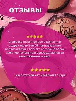 Характеристики Цвет: №01 NATURAL Объем: 15gr Описание Тип кожи: для всех типов кожи, включая чувствительную. Основные эффекты: пудра выпускается в двух оттенках: более светлый придат коже легкий оттенок загара с румянцем, а более темный имеет свойства хайлайтера, высвечивая смуглую кожу. Великолепная стойкость и естественность покрытия. Отличительные особенности: пудра обеспечивает легкое, невесомое, очень нежное покрытие для кожи с эффектом загара; не сушит кожу, обладает отличной адгезией и мелкопудровой текстурой, не заметной глазу; пудру можно использовать как бронзатор, для моделирования лица и придания ему скульптурности; подходит для всех типов кожи, даже для чувствительной; бережет вашу кожу, не засоряя е поры. Способ применения Наносите пудру спонжем или кистью, на чистую, сухую кожу лица, предварительно увлажннную кремом под макияж.