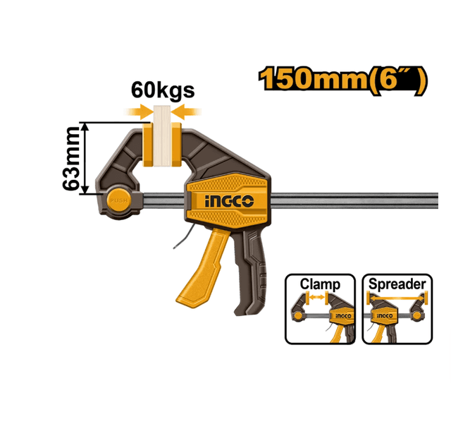 Быстрозажимная струбцина INGCO 63х150 мм HQBC01601 представляет собой удобное приспособление для фиксации заготовок. Опорная губка перемещается и фиксируется по всей длине направляющей при помощи рукоятки, а также может переставляться на другой конец направляющей, что позволяет использовать струбцину «на разжим». Max усилие:580 Н Вид струбцины:быстрозажимная Назначение:по дереву, металлу Глубина зажима:63 мм Материал рамы:сталь Ширина зажима:150 мм Вес нетто:0.365 кг