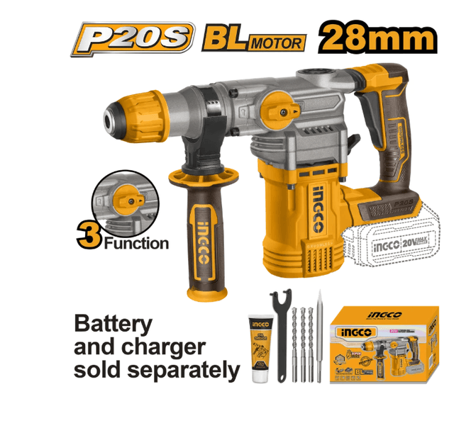 Аккумуляторный бесщеточный перфоратор SDS-Plus INGCO CRHLI20288 INDUSTRIAL 20 В 4,5 Дж предназначен для сверления отверстий в бетоне, кирпиче и природном камне, а также для легких долбежных работ. Он также пригоден для сверления отверстий в древесине, металле, керамике и синтетических материалах. Модель оборудована мощным бесщеточным двигателем, что обеспечивает отличную производительность и долгий срок службы. В комплекте с инструментом не поставляется аккумулятор и зарядное устройство, что позволяет выбрать аккумулятор емкостью 2,0/4,0/5,0/6,0/7,5/8.0 А.ч. под ваши задачи и время работы. Есть безударный режим работы для использования инструмента в качестве шуруповерта. Комплектация: перфоратор, эргономичная рукоятка, буры 8/10/12 SDS-plus - 3 шт., пика 160мм SDS-plus - 1 шт., смазка для хвостовиков инструмента 1 шт., ключ для отвинчивания крышки редуктора, паспорт, гарантийный талон. Преимущества перфоратора INGCO CRHLI20288: 3 режима работы сверление/сверление с ударом/ удар без сверления Боковая рукоятка - для удержания инструмента двумя руками. Перфоратор снабжен системой антивибрации - ANTI-VIBRATION SYSTEM Автоматическая предохранительная муфта, отсоединение привода при блокировке сверла для обеспечения безопасности во время работ Система защиты аккумулятора от перегрузки, перегрева и глубокого разряда