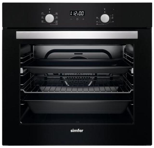 Духовой шкаф Simfer B6EP208GGB – это электрическая независимая модель в черном цвете. Он обладает объемом духовки 60-67 литров и предлагает несколько режимов нагрева, включая конвекцию и гриль. Управление осуществляется поворотными переключателями, также может присутствовать таймер.