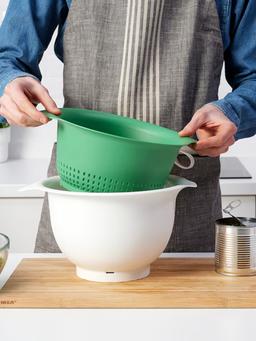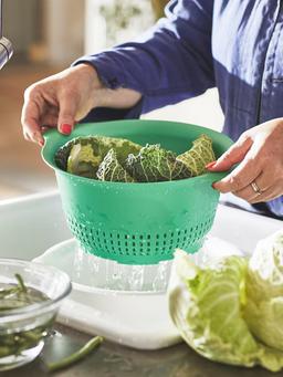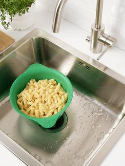 Сито диаметром 24 см в светло-зелёном цвете удобно для приготовления и мытья продуктов. Лёгкое и прочное изделие.