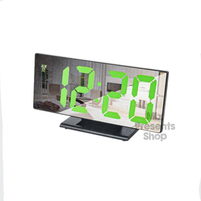 Стильные электронные цифровые часы-будильник с интересным зеркальным решением дисплея. Работают от USB DC5V. Имеют батарейку для памяти времени в случае отключения электричества. Model: 3618L Имеют кнопку регулировки яркости дисплея и его отключения. Настройка режимов работы: циклическая смена (часы, дата, температура) и постоянное отображение времени. Функция автоматического отключения экрана через 30 сек. Есть также два порта USB для зарядки ваших гаджетов или телефонов. • Часовой формат: 12/24 часа • Электронный будильник • Размер цифр, мм: 55 • Питание USB 5V • Резервное питание: есть • Цвет свечения: зеленый. Размер: 18,5 × 9,5 см