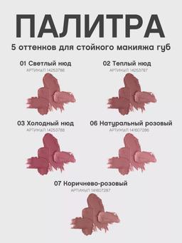Характеристики Цвет: №06 НАТУРАЛЬНЫЙ РОЗОВЫЙ Объем: 1.35gr Описание Нежная кремовая текстура легко наносится, быстро фиксируется и не сушит губы. Устойчивая формула держится на коже весь день и не дает помаде и блеску растекаться. Универсальные насыщенные оттенки идеально дополнят любой макияж! Способ применения Очертите контур губ и растушуйте линию внутрь, чтобы мягко соединить с помадой или блеском. Или накрасьте карандашом всю поверхность губ.