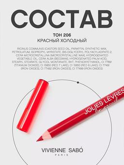 Характеристики Цвет: №206 КРАСНЫЙ ХОЛОДНЫЙ Объем: 1.4gr Описание Карандаши для губ Jolies Levres благодаря насыщенному цвету очень легки в использовании. Вы одним касанием получаете идеальный контур или полный макияж губ, который будет держаться весь день. Легкая текстура предотвращает растекание губной помады и блеска. А широкая палитра оттенков позволит выбрать тот самый "свой" цвет! Способ применения Очертите контур губ и растушуйте линию внутрь, чтобы мягко соединить с помадой или блеском. Или накрасьте карандашом всю поверхность губ.