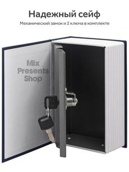 Книга сейф это секретный тайник на вашей полке. Закрывается на ключ. Используется для ограничения доступа посторонних лиц. Незаметен на книжной полке дома и в офисе. Отлично подойдет в качестве подарка или сувенира. Тип замка: ключевой. Назначение: для мелких ценностей. Количество отделений-1. Количество ключей в комплекте-2. Цвет-стилизован под книгу. Высота: 24 см