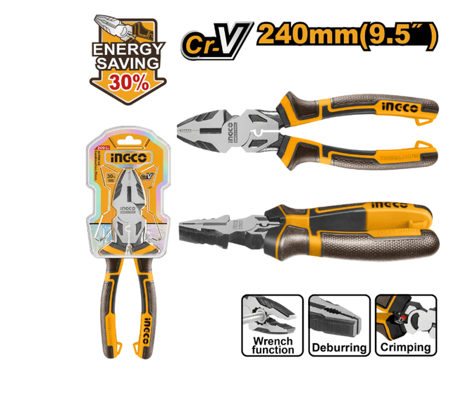 Размер: 9,5 дюйма/240 мм. Экономия энергии на 30 % по сравнению с обычными плоскогубцами. Материал: Cr-V Обработка поверхности: черная отделка и полировка Трехцветная ручка из TPR для надежного захвата и комфорта С функцией обжима С функцией гаечного ключа С функцией удаления заусенцев Упаковано в двойной двойной блистер