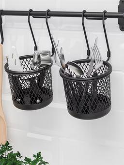 Чёрный сетчатый контейнер размером 14x16 см. Крепится на рейлинговую систему HULTARP. Отлично подходит для хранения мелочей на кухне. Прочный металлический материал и стильный дизайн.
