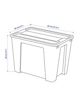 IKEA SAMLA — это универсальный и прочный прозрачный контейнер из полипропиленового пластика, разработанный для эффективного и компактного хранения. Ширина: 39 см Глубина: 28 см Высота: 28 см Объем: 22 л