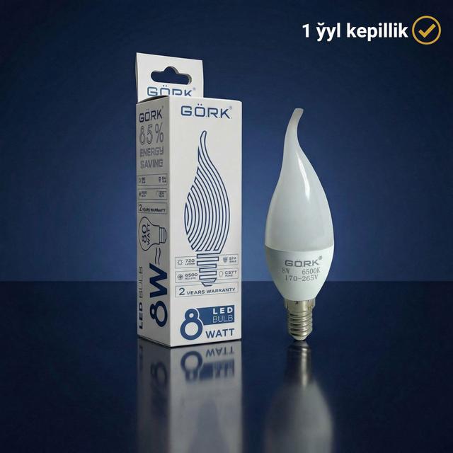 Светодиодная лампа G.Ö.R.K. мощностью 8 Вт в элегантной форме «свеча на ветру» (C37T) сочетает в себе эстетику и современные технологии. Холодный белый свет (6500K) обеспечивает максимальную яркость и четкость, что делает её идеальным выбором для рабочих кабинетов, кухонь и коммерческих помещений. Узкий цоколь E14 подходит для большинства классических люстр и декоративных бра, а энергосберегающая технология позволяет значительно снизить расходы на электричество. Мощность: 8 Вт (высокая яркость при малом потреблении). Цоколь: E14. Форма: C37T (декоративная свеча с изогнутым кончиком). Цветовая температура: 6500K (холодный дневной свет). Производство: Туркменистан.