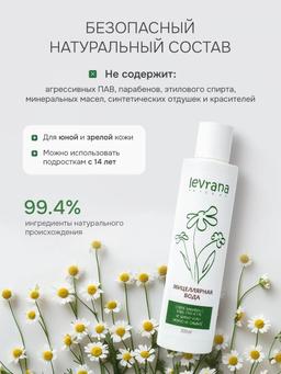 Нежное очищение и увлажнение для всех типов кожи. Созданная на основе водного экстракта ромашки, мицеллярная вода мягко снимает макияж с лица, век и губ, увлажняя кожу и сохраняя её естественный баланс. Что делает: — Эффективно удаляет макияж и загрязнения — Увлажняет и успокаивает кожу — Сохраняет гидро-липидный барьер — Не вызывает раздражения глаз и кожи Ключевые компоненты: 🔸 Водный экстракт ромашки — успокаивает, снимает раздражения 🔸 Экстракты зверобоя и мать-и-мачехи — смягчают, способствуют регенерации 🔸 Экстракт чабреца и крапивы — тонизируют, укрепляют кожу 🔸 Бисаболол и эфирное масло ромашки — уменьшают покраснения, дарят комфорт Особенности: ✔️ 100% натуральный состав ✔️ Не щиплет глаза и кожу ✔️ Не требует смывания ✔️ Подходит для ежедневного применения Способ применения: Нанести на ватный диск, мягко очистить кожу лица, век и губ. Использовать по необходимости, утром и/или вечером. Предупреждение: Возможна индивидуальная непереносимость ингредиентов. Состав: Aqua (Вода), Chamomilla Recutita Flower Water (Водный экстракт ромашки), Coco-glucoside (Мягкое ПАВ), Pentylene Glycol (Растительный пентиленгликоль), Benzyl Alcohol (Бензиловый спирт), Lavandula Angustifolia flower oil (Эфирное масло лаванды), Benzoic Acid (Бензойная кислота), Hypericum perforatum L. Extract (Экстракт зверобоя), Tussilago farfara L. Extract (Экстракт мать-и-мачехи), Thymus serpyllum L. Extract (Экстракт чабреца), Urtica dioica L. Extract (Экстракт крапивы), Betula pubescens Echr. Extract (Экстракт почек березы), Melaleuca alternifolia oil (Эфирное масло чайного дерева), Matricaria recutita Flower Oil (Эфирное масло ромашки), Bisabolol (Бисаболол).
