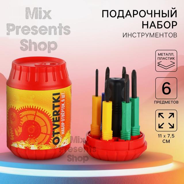 Подарочный набор инструментов — это символ мастерства и заботы, который станет незаменимым помощником в любых делах. Подарочный набор в банке состоит из 6 предметов, каждый из которых будет полезен и надежен в тысячах жизненных ситуациях: при ремонте автомобиля или бытовой техники, при сантехнических работах в квартире или на даче и так далее. Оригинальный дизайн кейса послужит еще одним приятным дополнением для любого мужчины. На дне также есть открывалка. В наборе: 6 отверток