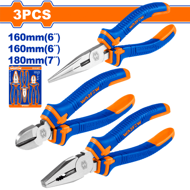 Размер: 7" Плоскогубцы комбинированные 6" Плоскогубцы с длинными носами 6" Диагональные кусачки Полироль и антикоррозионное масло Двухцветная ручка Упакована в выдвижную картонную коробку