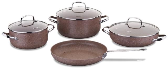 Набор посуды KORKMAZ Browni A2900 изготовлен из прочного алюминия и имеет внутреннее антипригарное покрытие, часто описываемое как "гранитное" или имитирующее вулканит, которое обладает высокой стойкостью к царапинам и отличными антипригарными свойствами. Внешняя поверхность имеет устойчивое к пятнам покрытие коричневого цвета. Ручки выполнены из нержавеющей стали (иногда с силиконовыми вставками для удобства), а крышки изготовлены из термостойкого стекла. Материалы, используемые в производстве, заявлены как экологически чистые и не содержащие вредных тяжелых металлов.