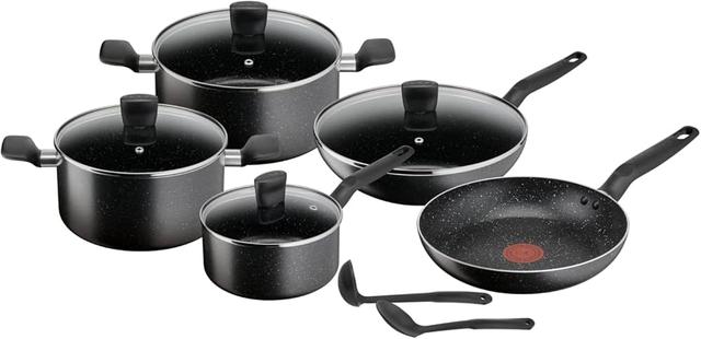 Набор посуды Tefal Dark Stone выполнен из алюминия и оснащен антипригарным покрытием Mineralia, усиленным минералами. Это покрытие обеспечивает хорошее скольжение продуктов и позволяет готовить с минимальным использованием масла или совсем без него. Покрытие безопасно для здоровья, так как не содержит PFOA, свинца и кадмия. Внешняя поверхность посуды имеет привлекательный черный цвет, часто с эффектом "под камень" или "мрамор". Посуда оснащена удобными фиксированными ручками из бакелита, которые не нагреваются в процессе готовки. Сотейники и кастрюли, как правило, комплектуются стеклянными крышками, что позволяет контролировать приготовление. Сковороды могут иметь индикатор температуры Thermo-Signal™, который меняет цвет, показывая оптимальный момент для начала приготовления.