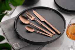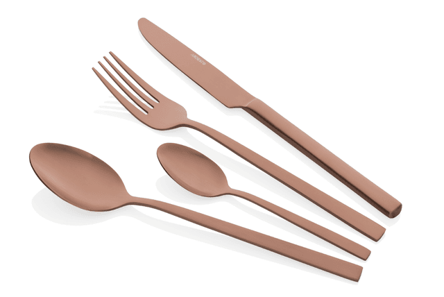 Ardesto AR0704FSC — набор столовых приборов Black Mars Favola из 4 предметов: столовой ложки, столовой вилки, столового ножа и чайной ложки. Характеристики: Материал: нержавеющая сталь. Цвет: медный. Страна производства: Китай. Дизайн: элегантный, эргономичный. Особенности: можно мыть в посудомоечной машине. Размеры предметов: столовая ложка — 205 мм; столовая вилка — 209 мм (толщина 3 мм); столовый нож — 223 мм; чайная ложка — 141 мм (толщина 2,5 мм). Вес предметов: нож — 88 г, вилка — 40 г, ложка — 45 г, чайная ложка — 21 г.