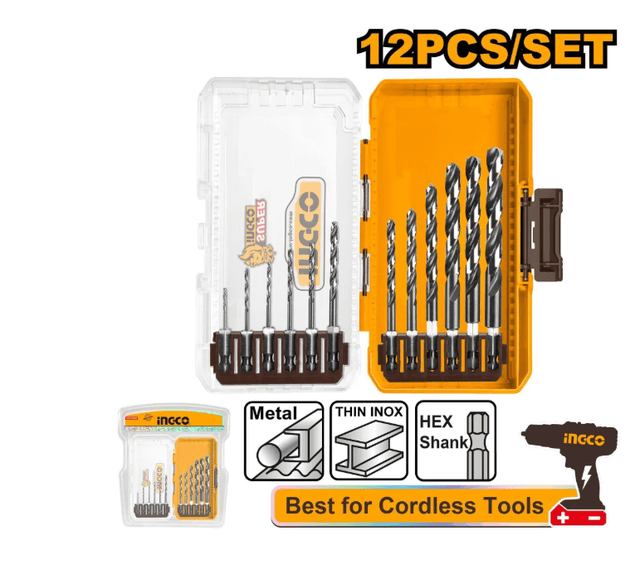 INGCO AKDL11206 INDUSTRIAL — набор спиральных свёрл по металлу, в комплекте 12 шт. Основные характеристики: назначение: для работы по металлу; материал: быстрорежущая сталь HSS (HSS 4341); тип хвостовика: шестигранный (1/4HEX — E); режим работы: без удара; диапазон диаметров: 1–10 мм; длина: 50–130 мм; рабочая длина: 10–90 мм; угол заточки: 135°.