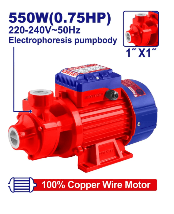 EWPPV05501 — периферийный водяной насос бренда Emtop. Некоторые характеристики: напряжение: 220–240 В, частота: 50 Гц (вилка BS); номинальная мощность: 550 Вт (0,75 л. с.); максимальный напор: 45 м; максимальный расход: 45 л/мин; максимальное всасывание: 8 м; диаметр трубы: 1 дюйм × 1 дюйм; двигатель с медной проволокой; латунное рабочее колесо;