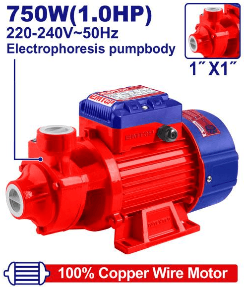 EWPPV07501 — водяной насос бренда EMTOP. Некоторые характеристики: напряжение: 220–240 В, частота: 50 Гц; мощность: 750 Вт (1 HP); максимальный напор: 52 м; максимальный расход: 50 л/мин; максимальный уровень всасывания: 8 м; диаметр трубы: 1 ″×1 ″; мотор: медный провод; крыльчатка: латунная;