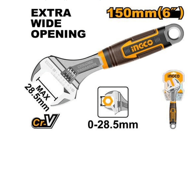 Разводной ключ INGCO HADW131068 INDUSTRIAL 150 мм, предназначенный для монтажа/демонтажа крепежных элементов, изготовлен из хромованадиевой стали высокого качества. Регулируемый размер зева до 24 мм позволяет применять один инструмент для работы с различными типоразмерами крепежа. Двухкомпонентная рифленая рукоятка удобно ложится в руку предотвращая скольжение. Рабочая часть выполнена из хромованадиевой стали. Длина: 150 мм Покрытие: хромованидиевое Материал: хромованадиевая сталь CrV Max расстояние между губками: до 24 мм Толщина губок: 10 мм Вес: Нетто - 0,16 кг, Брутто - 0,2 кг. Параметры упакованного товара: Длина - 24 см, Ширина -