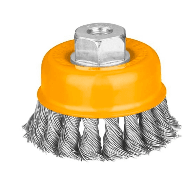Щетка чашеобразная витая INGCO WB21001 100 мм применяется совместно с угловыми шлифовальными машинами и предназначена для снятия лака, краски, зачистки от ржавчины металлических поверхностей и изделий. Рабочая часть состоит из скрученной в пучки стальной проволоки Диаметр: 100 мм Вес: 0,51 кг. Параметры упакованного товара: Длина - 20 см, Ширина - 14 см, Высота - 6 см