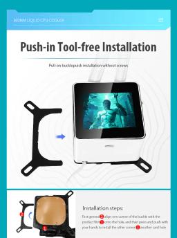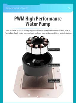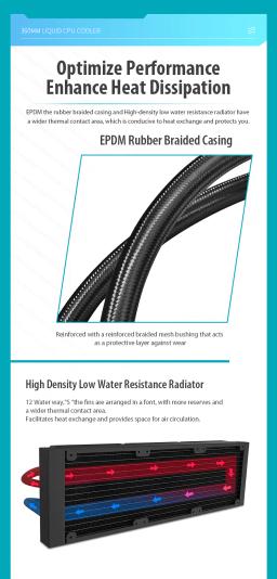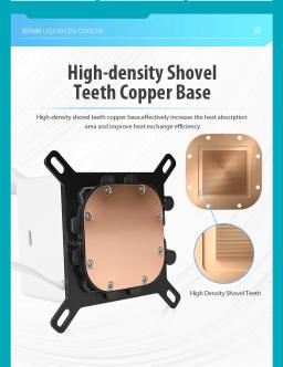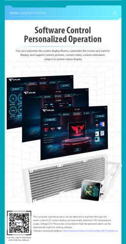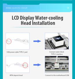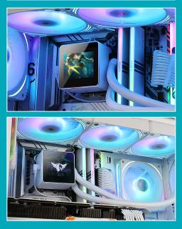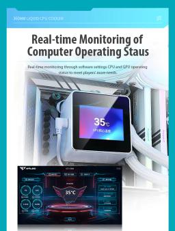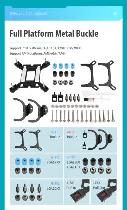 🔧 Радиатор Размер: 397 × 120 × 27 мм Материал: алюминий Длина шлангов: 450 мм 💧 Помпа Размер: 67.5 × 67.5 × 55.3 мм Скорость: 1800–3000 об/мин (±10%) Напряжение: 12V DC Потребляемая мощность: 3.36 Вт Подшипник: керамический Подключение: 4-pin PWM Экран: IPS HD LCD 🌪 Вентиляторы (3 × 120 мм) Размер: 120 × 120 × 25 мм Скорость: 800–2000 об/мин (±10%) Воздушный поток: 79.5 CFM Статическое давление: 3.1 ммH₂O Уровень шума: 30 дБА Подшипник: FDB (гидродинамический) ⚙ Поддержка платформ Intel: LGA115X / 1200 / 1700 / 20XX AMD: AM3 / AM4 / AM5