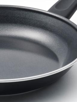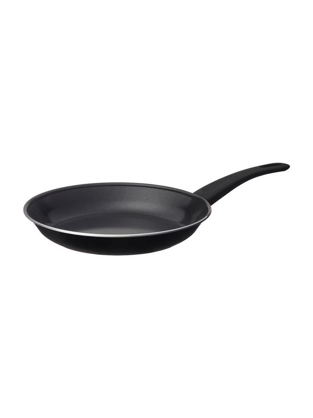 Чёрная сковорода диаметром 24 см, удобна для жарки и приготовления разных блюд. Прочная и легко моется.