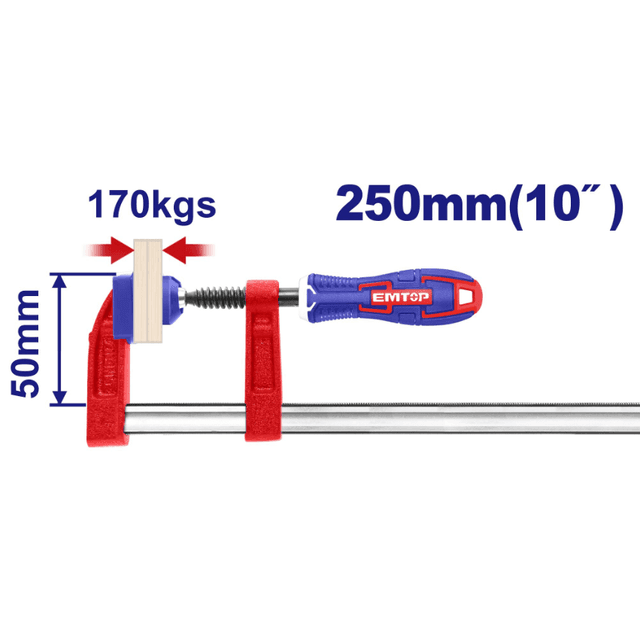 Emtop ECLPF05301 — F‑образная столярная струбцина размером 50×250 мм, выполнена из углеродистой стали с хромированным покрытием, максимальная сила зажима — 170 кг, резьбовой винт с диаметром 11 мм, штанга толщиной 5 мм и шириной 15 мм, пластиковая рукоятка, вес ≈ 0,44 кг, производство — Китай.