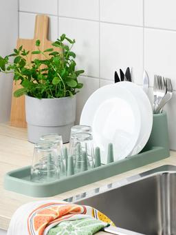Сушилка длиной 48 см, идеально подходит для сушки и хранения посуды. Светло-серо-зеленый цвет добавляет свежий современный акцент на кухню. Пластиковая конструкция легкая и удобная в уходе.