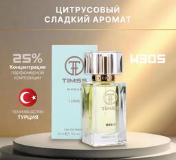 TIMSS W305 - это парфюмерная вода для женщин объемом 50 мл, представляющая собой аналог популярного аромата Moschino I Love Love. Производится в Турции. Аромат классифицируется как цитрусовый цветочный древесный мускусный.