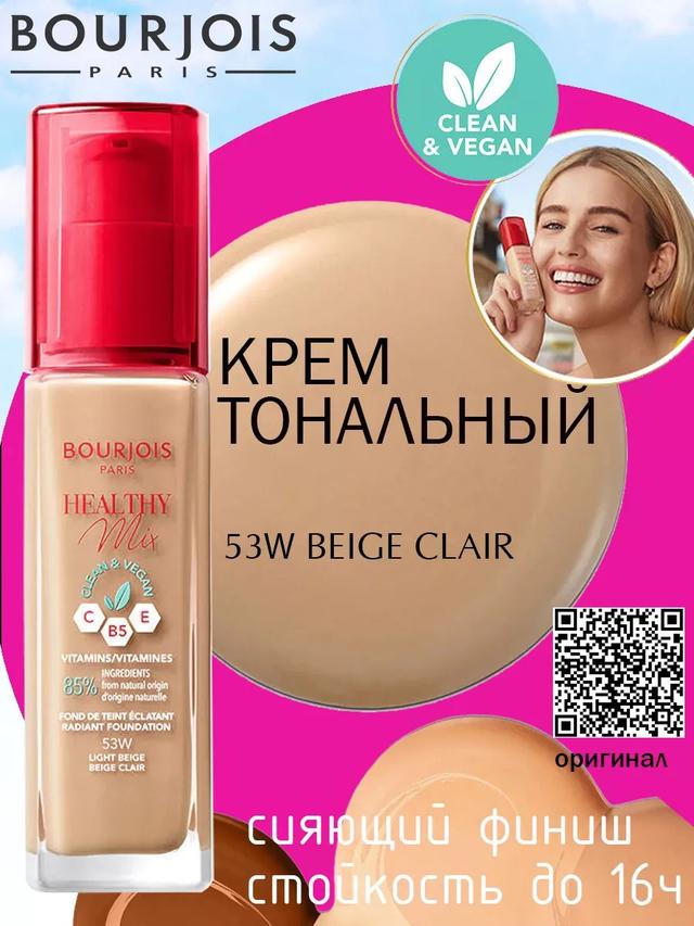 Характеристики Цвет: №53W LIGHT BEIGE Объем: 30ml Описание Тональный крем Bourjois Healthy Mix Foundation. Мягкая и легкая текстура с витаминно-фруктовым комплексом скрывает недостатки, помогая достичь сияющего и безупречного тона. Тональный крем усиливает естественное сияние кожи и улучшает эластичность, визуально сокращая глубину морщинок. Эффект сияния и увлажнения продлится в течение 8 часов. Способ применения Нанесите небольшое количество средства на увлажненное лицо в направлении от лба к подбородочной линии и распределите пальцами или сухим спонжем.