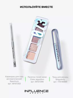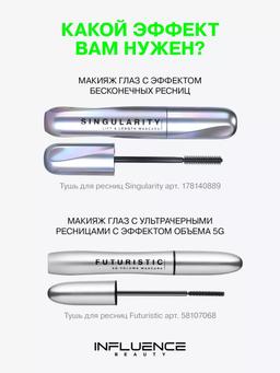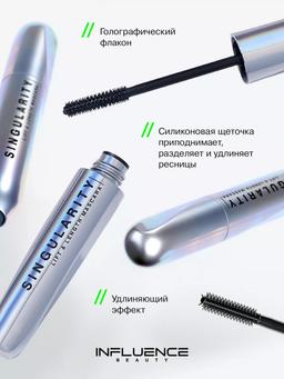 Характеристики Цвет: №01 BLACK / ЧЕРНЫЙ Объем: 13ml Описание Singularity - удлиняющая тушь для ресниц от Influence Beauty в обновленном футуристичном флаконе. Он, словно загадочная голографическая призма, играющая разноцветными оттенками света, приковывает внимание и создает неотразимый эстетический образ. Щеточка из мягчайшего силикона с широкими щетинками помогает формуле обволакивать волоски и приподнимает их у основания, надежно фиксирует, разделяет и удлиняет, создавая эффект бесконечных ресниц. Подобно сингулярности, они стремятся к бесконечности, а сила гравитации на них не действует. Способ применения Зигзагообразными движениям прокрашивайте реснички от внутреннего уголка к внешнему. При необходимости наносите в 2-3 слоя.