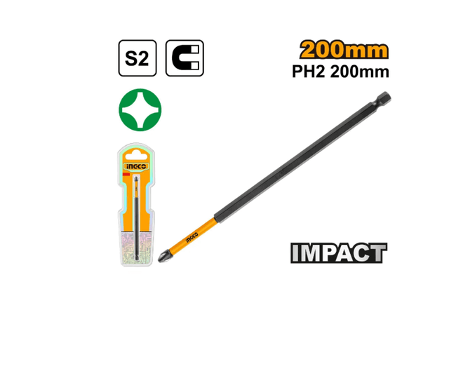 Бита для ударной отвертки PH2, 200 мм, 1 шт. S2, промышленная сталь, черная поверхность с магнитом. Упаковано в двойной блистер.