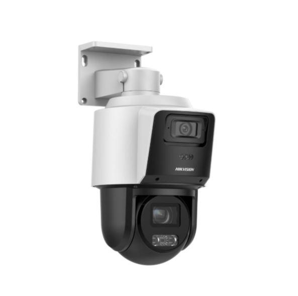 Это инновационная камера "два в одном", которая позволяет одновременно контролировать общую ситуацию и детально рассматривать объекты. Нижний фиксированный модуль обеспечивает постоянный широкий обзор территории, в то время как верхний поворотный модуль (PTZ) может вращаться и приближать изображение в 4 раза без потери качества. Такая конструкция гарантирует, что даже когда поворотный модуль следит за конкретным нарушителем, общий план территории остается под контролем. Камера оснащена интеллектуальной гибридной подсветкой Smart Hybrid Light и поддерживает технологию AcuSense для точного обнаружения людей и транспорта. Встроенный микрофон и динамик позволяют вести полноценный двусторонний диалог. Благодаря функции автоматического отслеживания (Auto Tracking), поворотная линза может самостоятельно следовать за движущейся целью, пока панорамная камера продолжает охранять весь периметр.