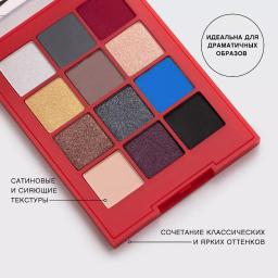 Палетка включает 12 рефилов с разнообразными текстурами, позволяя комбинировать матовые, сатиновые, сияющие и блестящие финиши для достижения желаемого эффекта в макияже глаз. Оттенки в палетке прекрасно дополняют друг друга, обеспечивая легкую растушевку и стойкость.