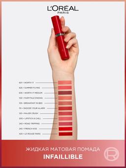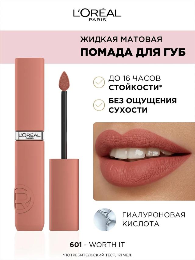 Характеристики Цвет: №601 WORTH IT Объем: 5ml Описание Жидкая матовая помада Infaillible – невесомое пудровое покрытие стойкостью до 16 часов без ощущения сухости. Инновационная формула с увеличенной концентрацией насыщенных пигментов и ухаживающими компонентами. Гиалуроновая кислота для эффекта объемных пудровых губ. Яркий стильный футляр с ультрамягким аппликатором для еще более чувственного и точного нанесения. Тот самый идеальный красный и широкая палитра трендовых нюдовых оттенков для каждой. А ты сможешь устоять? Ты этого достойна. Способ применения Начните нанесение от центра верхней губы по дуге купидона, затем двигайтесь по направлению к уголкам и заполните центр губ.