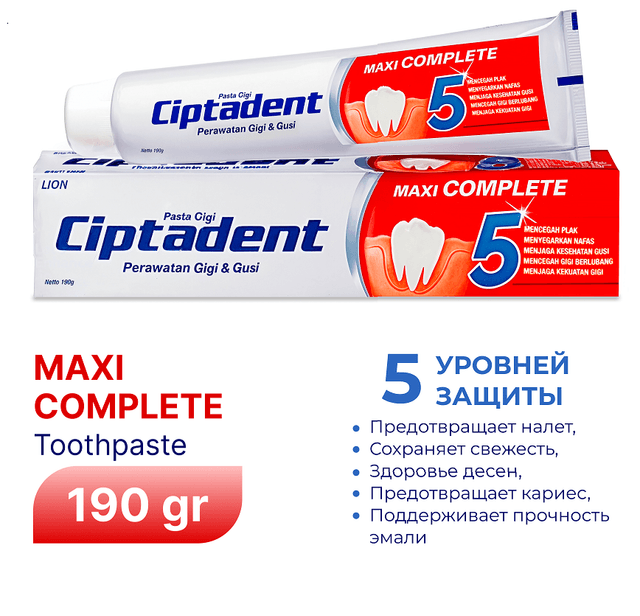 Ciptadent Maxi Complete 190 г — зубная паста для комплексного ухода за полостью рта. Она эффективно очищает зубы, предотвращает кариес и образование налёта, укрепляет эмаль и заботится о здоровье дёсен. Освежает дыхание и подходит для ежедневного использования всей семьёй. Благодаря сбалансированной формуле обеспечивает надёжную защиту и ощущение чистоты на весь день.