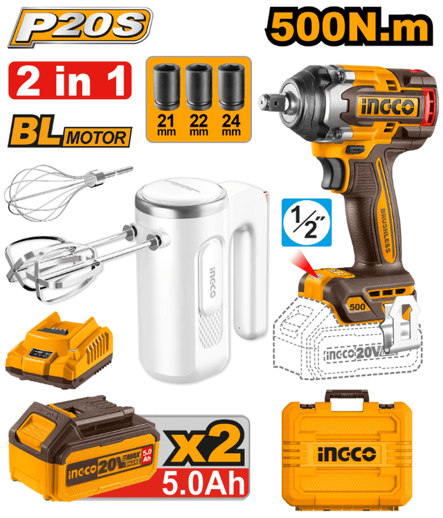 Naprýaženiýe: 20 V 1 sany simsiz urguly gaýkowýort (CIWLI2050) 1 sany simsiz eliňde saklanýan mikser (CHM021T) Simsiz urguly bolt gysgyç (CIWLI2050): Çotgasyz hereketlendiriji Naprýaženiýe: 20 V Kwadrat çykgy: 1/2" Ýüklenmezden aýlanma tizligi: 0–1200 / 0–1800 / 0–2200 aýl/min Zyňylma ýygylygy: 0–2400 / 0–2800 / 0–3300 urg/min Buraw güýji (ýelmek üçin): 500 Nm Buraw güýji (boşatmak üçin): 650 Nm Gurlan LED yşyklandyryjy Simsiz eliňde saklanýan mikser (CHM021T): Kuwwaty: 60 Wt Naprýaženiýe: 7,4 V DC Batareýanyň sygymy: 1500 mA·s 6 tizlikli Tizlik sazlaýyşly Aýyrmak üçin aýratyn düwme Saklamak üçin amatly sebet bilen bilelikde Toplumyň düzüminde bar: 1 sany guşak gysgyç 3 sany nasadka (21, 22, 24 mm) 2 sany süýt çalmak üçin taýak toplum 1 sany süýt köpürtgiçi 1 sany USB zarýad kabeli 2 sany batareýa 5,0 A·s (FBLI20031) 1 sany zarýad enjamy (FCLI2001) Zarýad naprýaženiýesi: 220–240 V ~ 50/60 Hz Ähli enjam göteriji futlýorda gaplanan