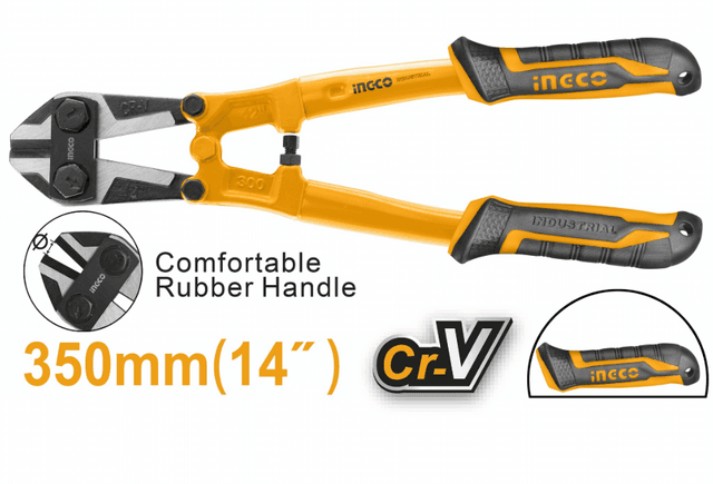 INGCO HBC0814 INDUSTRIAL bolt kesiji (boltorez) boltlary, berkidiş şaýlaryny, simleri we inçe armaturalary kesmek üçin ulanylýar. Tutawaçlary iki komponentli materialdan ýasalyp, rezinlenen goşundylary guralyň elden taýmagynyň öňüni alýar. Guralyň görnüşi: Bolt kesiji (boltorez) Topary: INDUSTRIAL Modeli: INGCO HBC0814 Guralyň uzynlygy: 350 mm Çybygyň diametri: 7 mm çenli Eňekleriniň materialy: hrom-wanadiý polady Cr-V