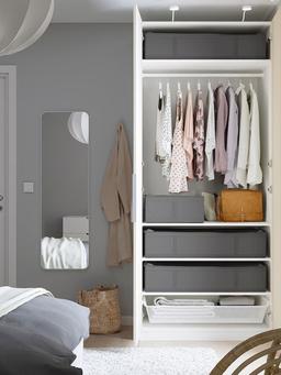 Maksady: Şkafyň (PAX) ýa-da düşegiň aşagyndaky ýeri guramak. Möwsümleýin eşikler we düşek esbaplary üçin ideal. Aýratynlyklary: Tozandan gorama (zamok bilen ýapylýar). Şemallatma (torly goýmalar). Çekmek üçin amatly tutuwaç. Ulanylmaýan wagty ýer tygşytlamak üçin ýygnalyp bilner.