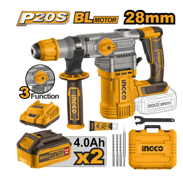 Çotkasyz dwigatel Naprýajeniýe: 20 V Ýüksüz aýlaw tizligi: 0-930 aýl/min Urgy ýygylygy: 0-4400 urg/min Urgy energiýasy: 4,5 J Maksimal burawlama ukyby: Beton: 28 mm Polat: 13 mm Agaç: 40 mm SDS Plus patron ulgamy