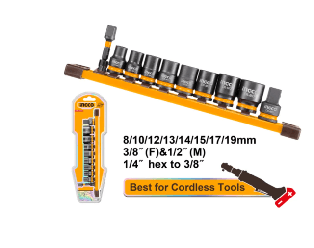 3/8"DR 10 sany urgyly (udarnyý) golowkalar toplumy. Öz içine alýar: 8 sany 3/8"DR urgyly golowka: 8/10/12/13/14/15/17/19 mm 1 sany 3/8"(F)&1/2"(M) urgyly golowka adapteri 1 sany 1/4" altyburçlydan 3/8" urgyly golowka adapteri Materialy: Cr-Mo Sowuk ekstruziýa Termiki işlenen Saklamak üçin amatly nyrhda (naprawläýuşiýada) berilýär CDRLI2060151/CDRLI206015/CDRLI2060152/CDRLI206015-3 modelleri üçin amatly Goşa blisterde gaplanan