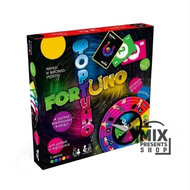 Fortuno aňsat we gyzykly düzgünleri bolan dinamiki, gyzykly oýun. Oýunçylaryň arasyndaky tizlik we yzygiderli gatnaşyk sizi gyzyklandyrar. Hem ulular, hem çagalar Fortuno oýnap bilerler. Ähli kartlaryňyzy ilkinji bolup aýyrmaly we beýleki oýunçylaryň hem şeýle etmegine ýol bermeli däl. Munuň üçin ýörite "aktiw" kartlaryňyz bolar: bir öwrümden geçmeli, ugry üýtgetmeli we başgalar. Emma iň möhüm kart "Fortuno". Ony goýmak bilen ruletka çarhyny aýladyňyz we ok bilen görkezilen hereketi ýerine ýetirdiňiz. Eger bagtly bolsaňyz, diňe bir öwrümde ýeňip bilersiňiz. Guralyşlar: Karton, kagyz; Materiallar: Karton, kagyz; Ýaş: 5+ Oýunçylar: 2+