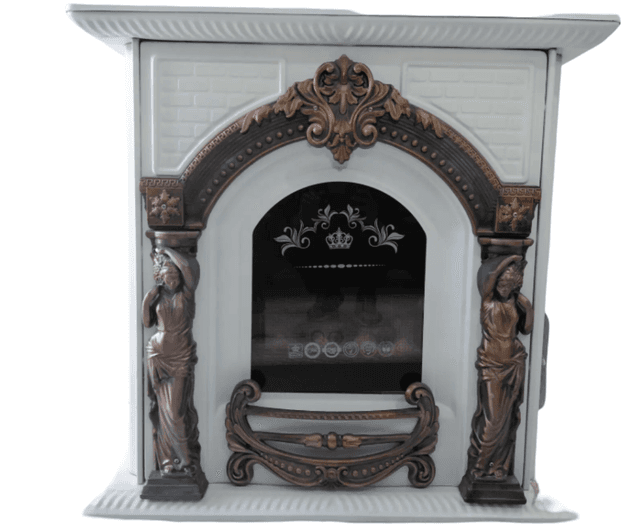 Nusgawy funksionallygy we nepis wintaž (köne usul) dizaýnyny birleşdirýän peç-kaminimizi hödürleýäris. Ak korpus baý bürünç/mis bezegleri bilen utgaşyp, asuda kaşaňlygyň we ýyly amatlylygyň atmosferasyny döredýär, bu bolsa nusgawy we rustik interýerlere ajaýyp laýyk gelýär. Dizaýn we estetika: Asylly utgaşma Reňk sazlaşygy: Arassa ak korpus bilen patina düşen bürünç bezegiň arasyndaky tapawut peçe adaty altyndan tapawutlanýan, asylly, antik görnüş berýär. Heýkelli bezeg: Fasad antik portal stilde bezelen. Esasy elementler, taryhy stilistikany nygtaýan, köne bürünç reňkde ýasalan, gapdallardaky iki sany kariatile (zenan heýkelleri) görnüşli heýkellerdir. Kerpiç öýme meňzeşligi: Arkaň ýokarky panelinde ak kerpiç öýme meňzeşligi bar, bu dizaýna göwrüm we çuňluk berýär. Oduň syny: Howpsuz we özüne çekiji janly oduň görnüşi üçin uly ýylylyga durnukly aýna bilen enjamlaşdyrylan. Aýnada şa stilini nygtaýan bezeg grafikasy (meselem, täç) bolmagy mümkin.