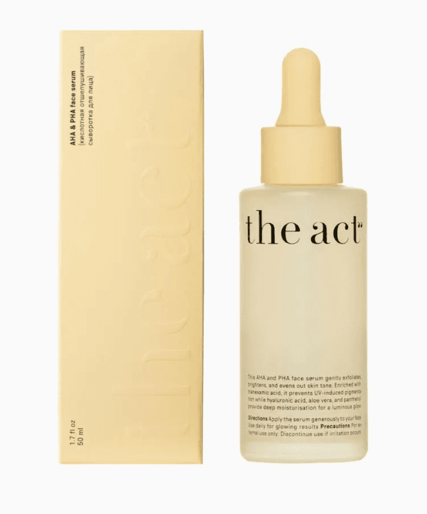 AHA we PHA kislotalary bilen baýlaşdyrylan ýüz syworotkasy (syworotka) derini ýuwaşlyk bilen täzeleýär we reňkini gowulandyrýar. Glikol we süýt kislotalary ýylmanaklaýar, glýukonolakton we laktobion kislotalary bolsa çyglandyrýar we köşeşdirýär. Traneksam kislotasy pigmentasiýa bilen işleýär, gialuron kislotasy, alýoe wera we pantenol bolsa çuňňur çyglandyrmagy üpjün edýär, derini ýylmanak we öwüşginli edýär. — gatan öýjükleri aýyryp, derini täzeleýär — reňkini deňleýär we gurluşyny gowulandyrýar — deriniň ýaglylygyny azaldýar, deşikçeleri (pory) arassalaýar — çyglandyrýar, dartgynlylygy (dartylyp durmagy) aýyrýar — duýgur (çenden aşa täsirli) derini köşeşdirýär — pigmentasiýanyň öňüni alýar — indiki idegiň täsirliligini ýokarlandyrýar GÖWRÜMI: 50 ML Syworotka — deriniň çuň gatlaklaryna işjeň maddalary gowşurmak üçin niýetlenen, ýokary konsentrasiýaly kosmetiki serişde. PHA kislotalar — Poli gidroksi kislotalar, AHA-lara garanyňda has ýumşak täsir edýän, esasan çyglandyryjy we ýüzleý arassalaýjy häsiýetli kislotalar. Pigmentasiýa — deride reňkli tegmilleriň emele gelmegi.