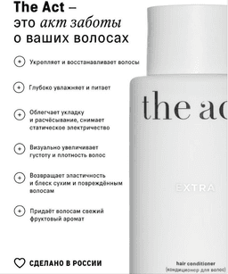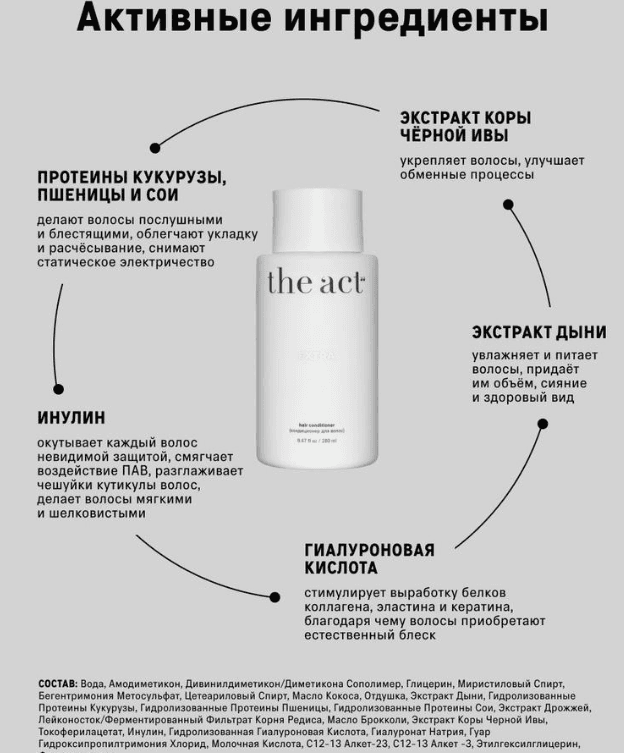 Ösümlik beloklaryny (proteinlerini), kokos we brokoli ýagyny, ösümlik ekstraktlaryny we gialuron kislotasyny öz içine alýan, intensiw nemlendiriji formulaly "Extra" (Ekstra) kondisioner saçy berkidýär, daramagy ýeňilleşdirýär, öwüşgin berýär, saçyň wizual galyňlygyny we dykyzlygyny artdyrýar. — iýmitlendirýär we nemlendirýär — saçyň gabyklaryny ýapýar, termiki täsirlerden goraýar we çyglylygy saklaýar — ýylmaýar we galmagallygy hem-de statik elektrik toguny azaldýar — çygalary aýyrýar, bejermegi we daramagy ýeňilleşdirýär — aňsat ýuwulýar YSY: ýetişen gawun MUKDARY 280 ML