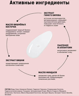 Ýylgyr (süýji) badam we ülje çigidi ýaglary, gara miwäniň gidrolaty, allantoin, pantenol, ülje we ginkgo biloba ekstraktlary — deňagramlylygy dikeldýär, iýmitlendirýär we ýumşadýar, guraklygy we gabyklanmagy aýyrýar. Ýeňil, ereýän gurluşy çalt siňýär, ýylmanaklyk we rahatlyk duýgusyny galdyrýar. — çyglandyrýar we iýmitlendirýär — gidrolipid deňagramlylygyny dikeldýär — köşeşdirýär, gyjyndyrmany we gabyklanmany aýyrýar — çalt siňýär, ýelmeşek gatlagy galdyrmaýar Ysy: Ülje, badam Göwrümi: 300 ml