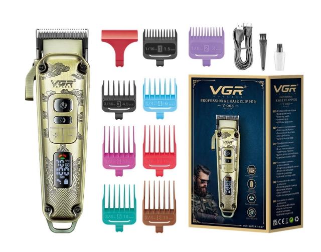 VGR V-005, professional derejede saç kesmek üçin niýetlenen enjamdyr. Saçyňyzy islendik uzalyga kesmek üçin birnäçe dürli başlyk bilen gelýär. Erkin we amatly ulanyp bolýar.